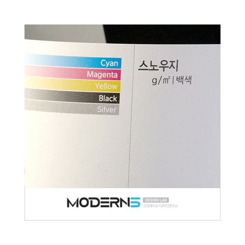 재질의 색상은 백색이며 재질면은 아트지에 비해 촉감이 부드럽고 광택이 없는 차분한 특징과